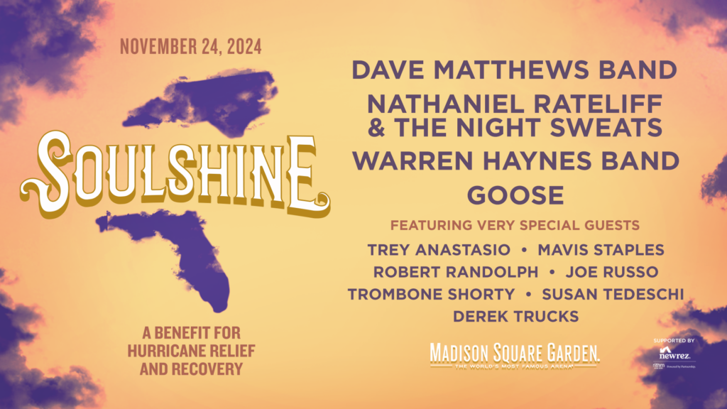 Dave Matthews Band has announced “SOULSHINE,” a benefit concert to aid relief and recovery efforts in Western North Carolina and Florida in the wake of Hurricanes Helene and Milton. The all-star event will take place at Madison Square Garden on Sunday, November 24, following DMB’s sold-out, two-night stand (November 22 & 23) and features Dave Matthews Band, Warren Haynes Band (whose hometown is Asheville), Nathaniel Rateliff & the Night Sweats and Goose. The evening also includes special guests Trey Anastasio, Mavis Staples, Robert Randolph, Trombone Shorty, Joe Russo, Susan Tedeschi and Derek Trucks.